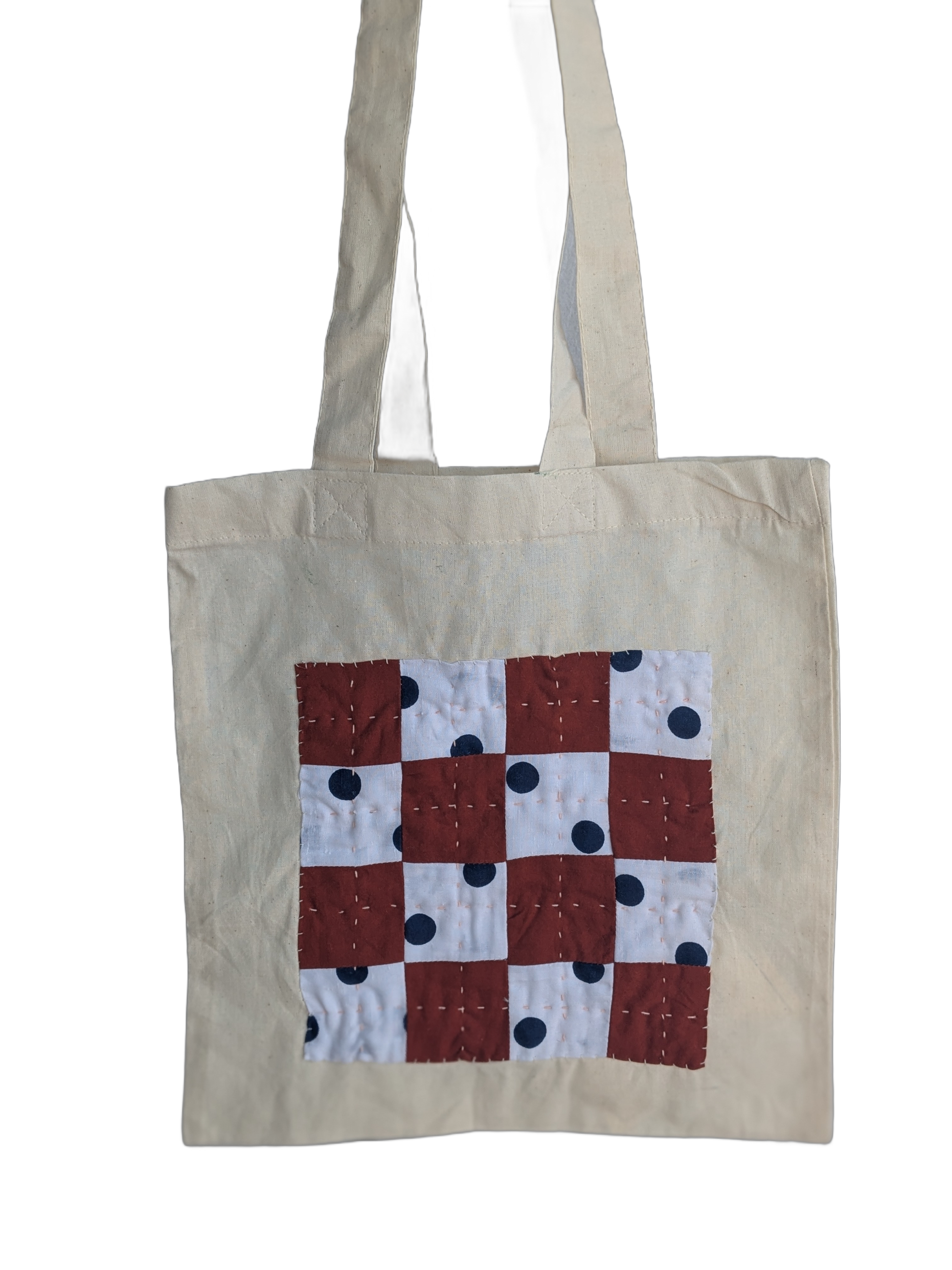 Reclaimed cotton tote whose old logo is covered with checkerboard patchwork. Machine pieced, hand quilted.