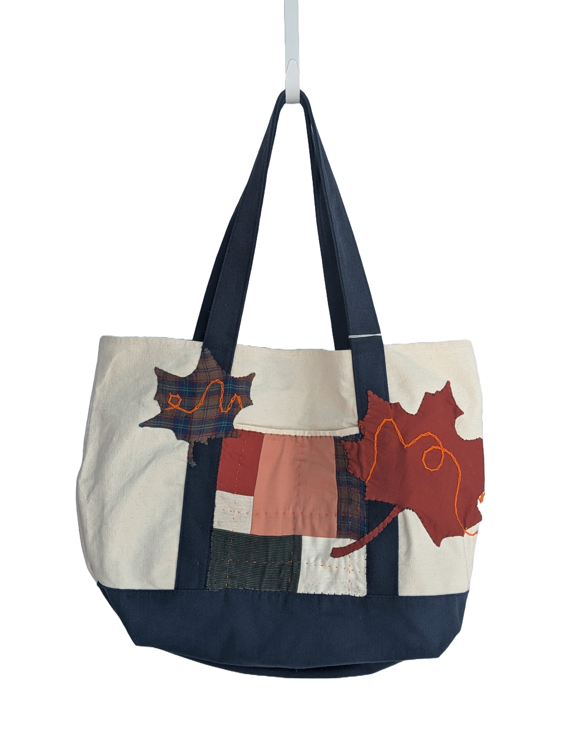 This cotton canvas tote has been given a new life by covering the old logo with fall inspired patchwork. Made with a mix of machine and hand sewing.