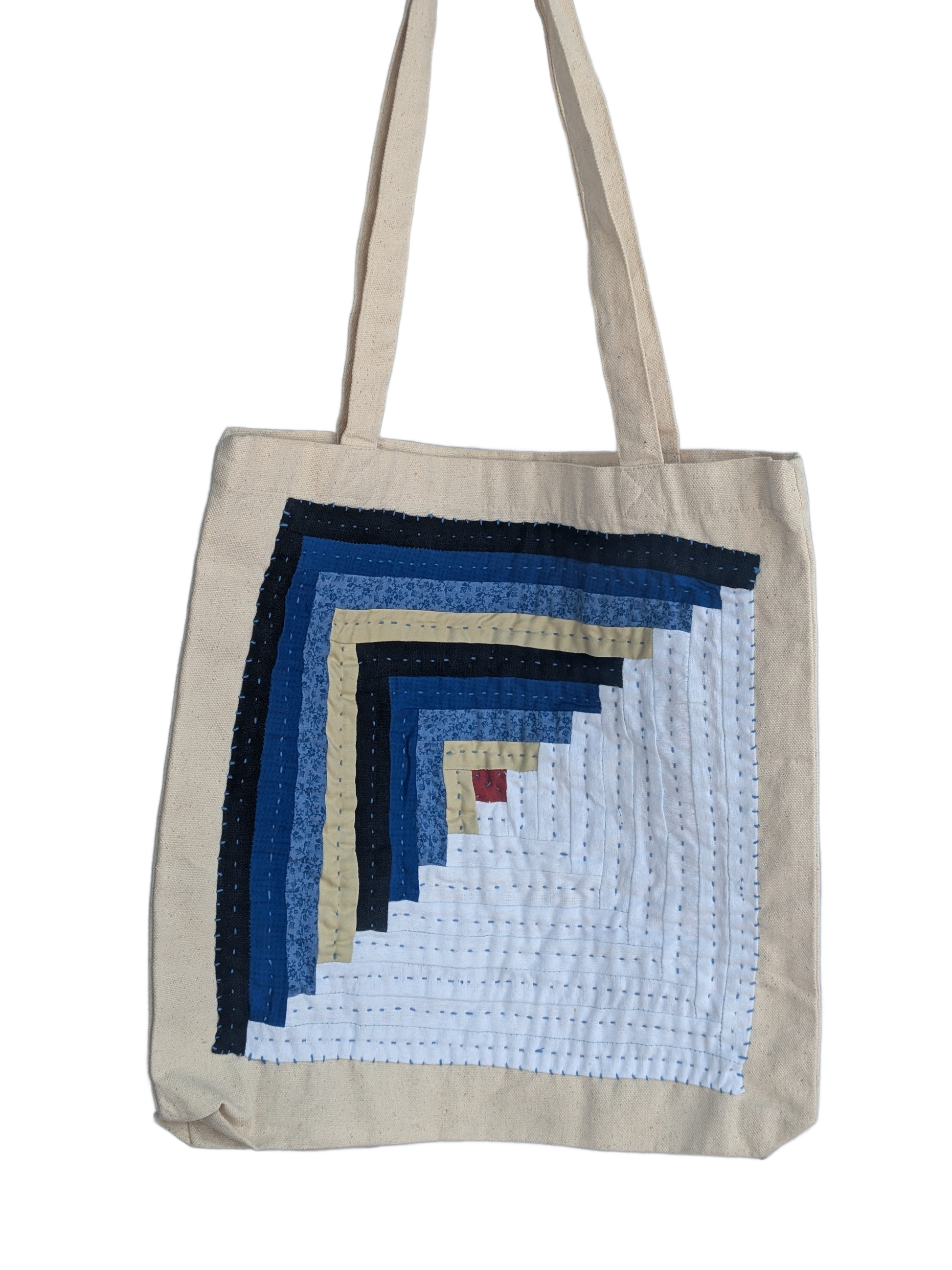 This cotton canvas tote has been given a new life by covering the old logo with a log cabin patchwork block. Machine pieced and hand quilted.