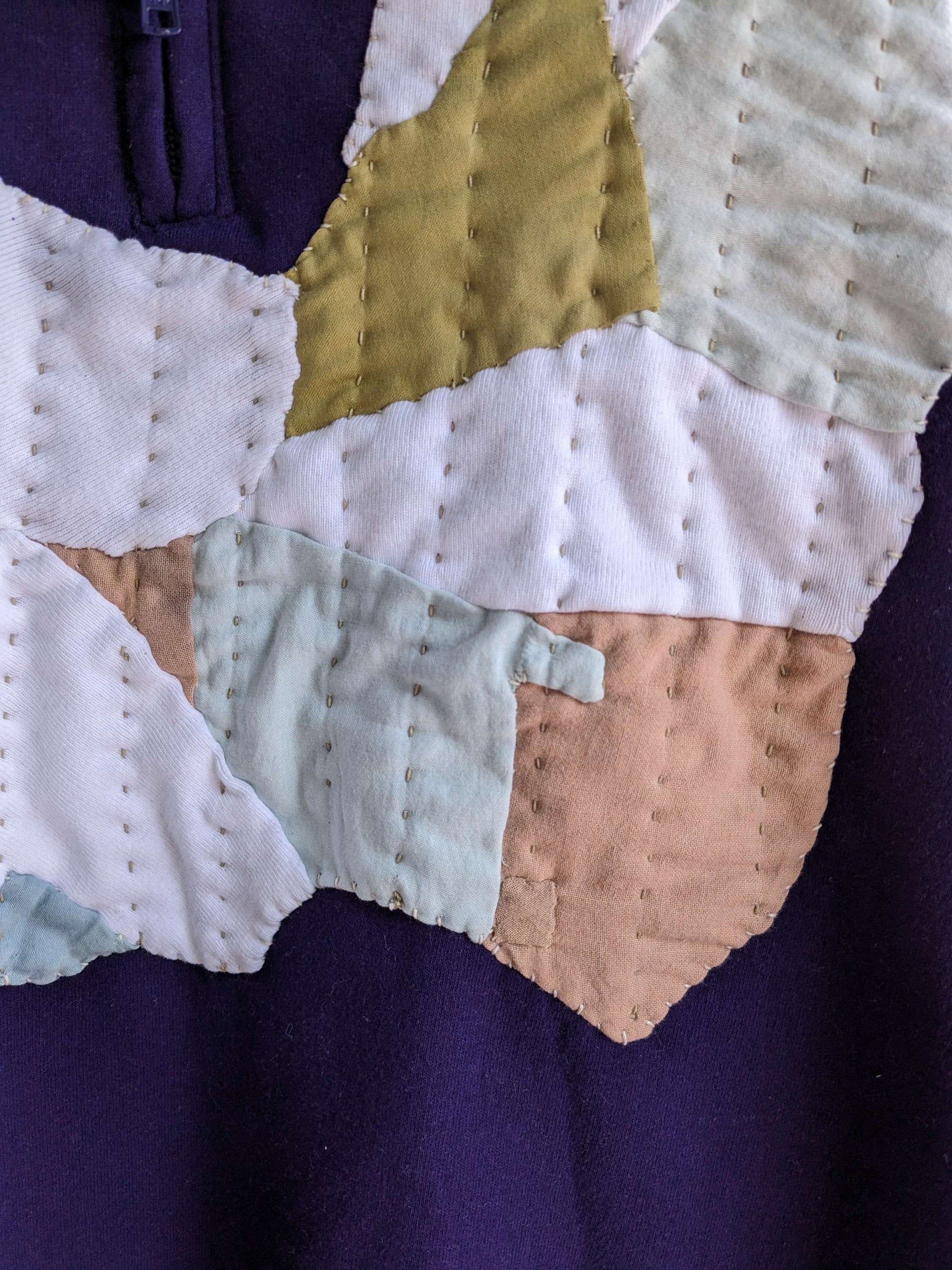 One of a kind wearable art pullover made from an upcycled sweatshirt. Design is hand stitched. Added fabric colors are dyed with plants. Size large, cotton poly blend.